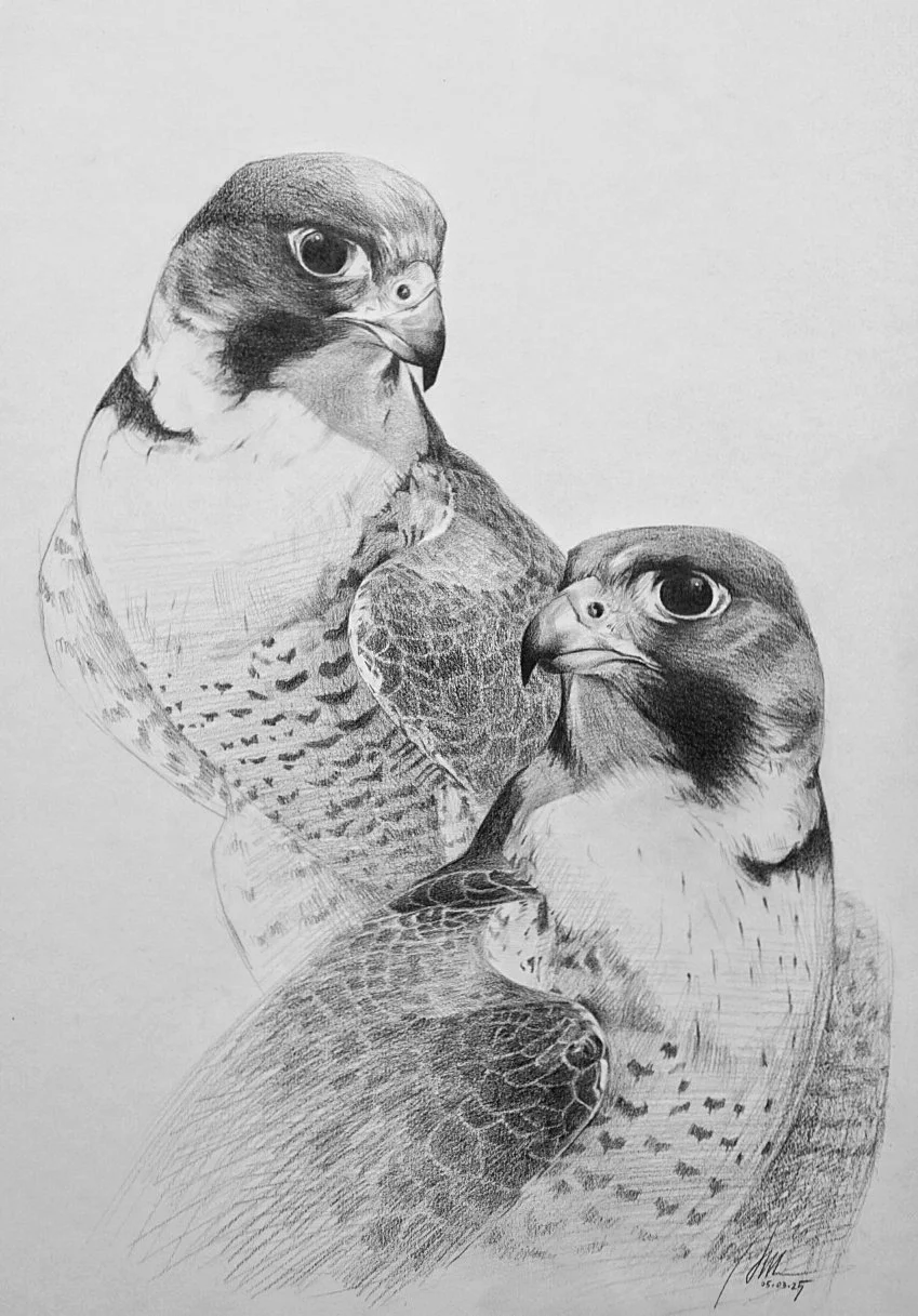 Dies ist eine persönliche Arbeit von mir, die allerdings ebensogut eine Auftragsarbeit hätte sein können. Für die Zeichnung wurden Vorlagenfotos zweier Wanderfalken verwendet. Wenn Sie geeignete Bilder Ihrer Haustiere oder Lieblingstiere haben, erstelle ich Ihnen gerne ähnliche Zeichnungen oder Gemälde mit ihrem Motiv.