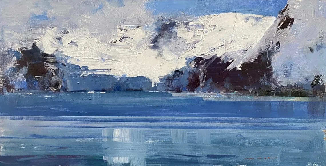 Zusammen mit seiner Frau Louise bereiste Ken Knight ab Februar 2020 die Antarktis. Sieben Tage lang befanden sie sich südlich des Südpolarkreises im Bereich der Antarktischen Halbinsel. Innerhalb von fünf Tagen malte Ken Knight dort von dem Schiff “Scenic Eclipse” aus 75 kleinformatige Landschaftsgemälde in Öl auf Maltafeln. Hinzu kommen mehrere anschließend im Studio gemalte Bilder in größerem Format.